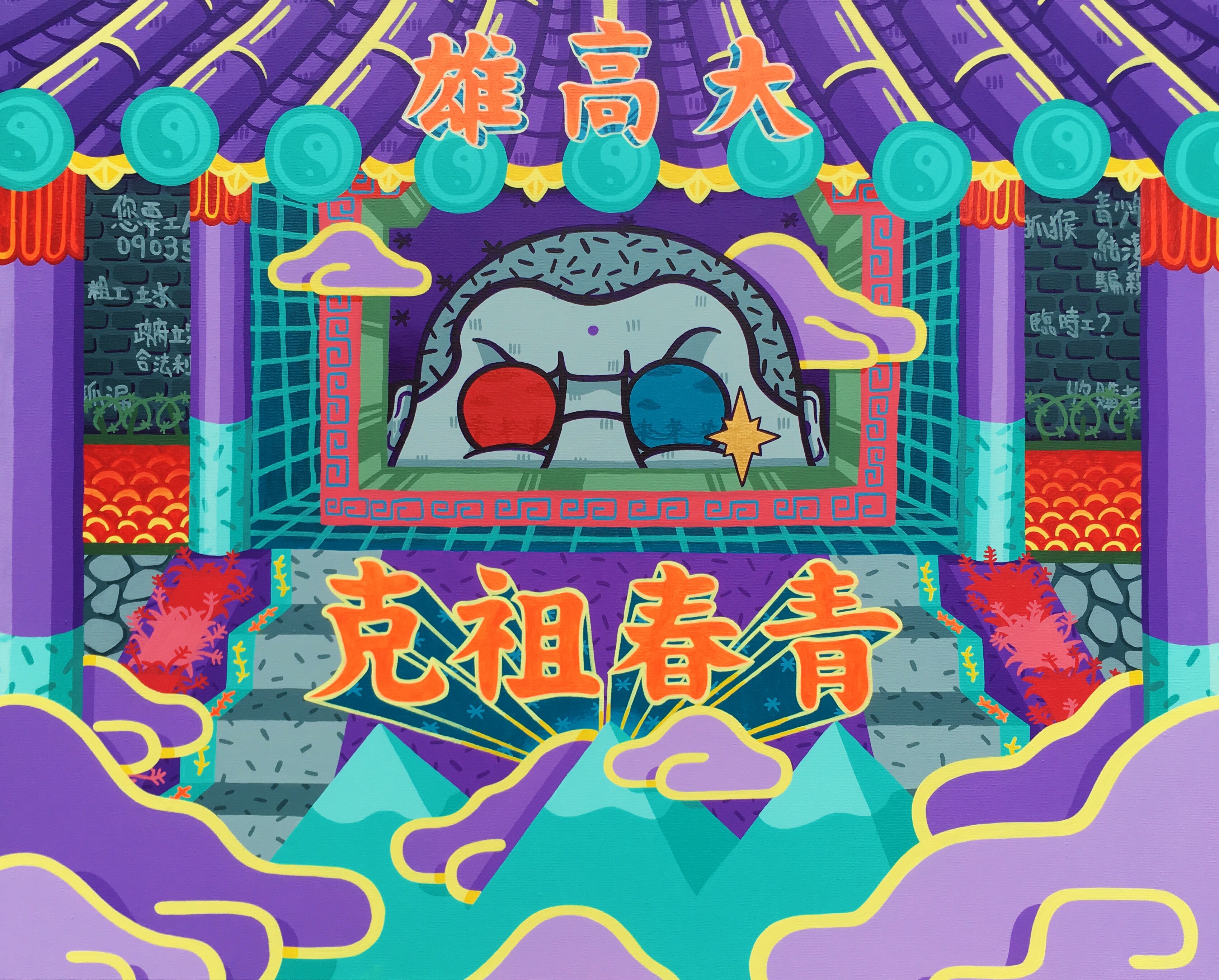 ZOOK! Is from Taiwan. Even though he never received an Arts education, this hasn’t stop him from developing an artistic career both locally and abroad. His paintings reflect his environment, a traditional Taiwanese culture in the middle of a modern, industrialized city. The juxtaposition of the old and new Taiwan inspires ZOOK!’s work and the way he lives his life. He has a unique personal style and has developed a set of symbols which allow him to reinterpret Taiwanese culture. Featuring bold colors, satire, and irony ZOOK! showcases his reality and gives a new image of Taiwan.